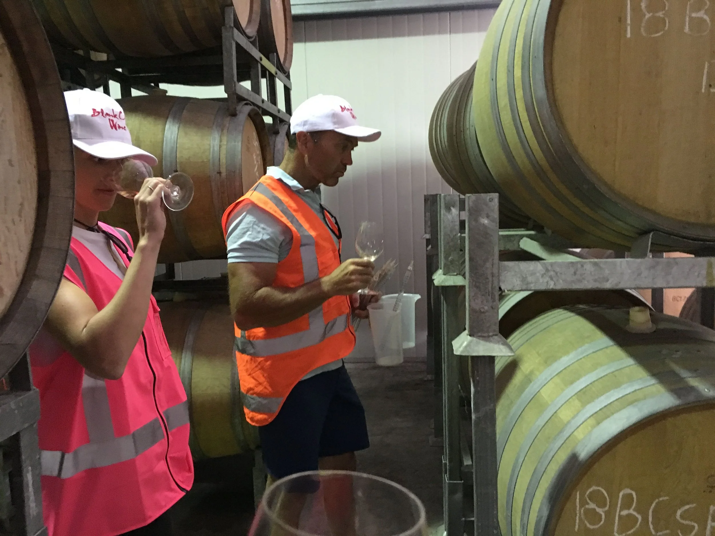 Sophie and Matt Thomson - tasting the Blank Canvas barrels.