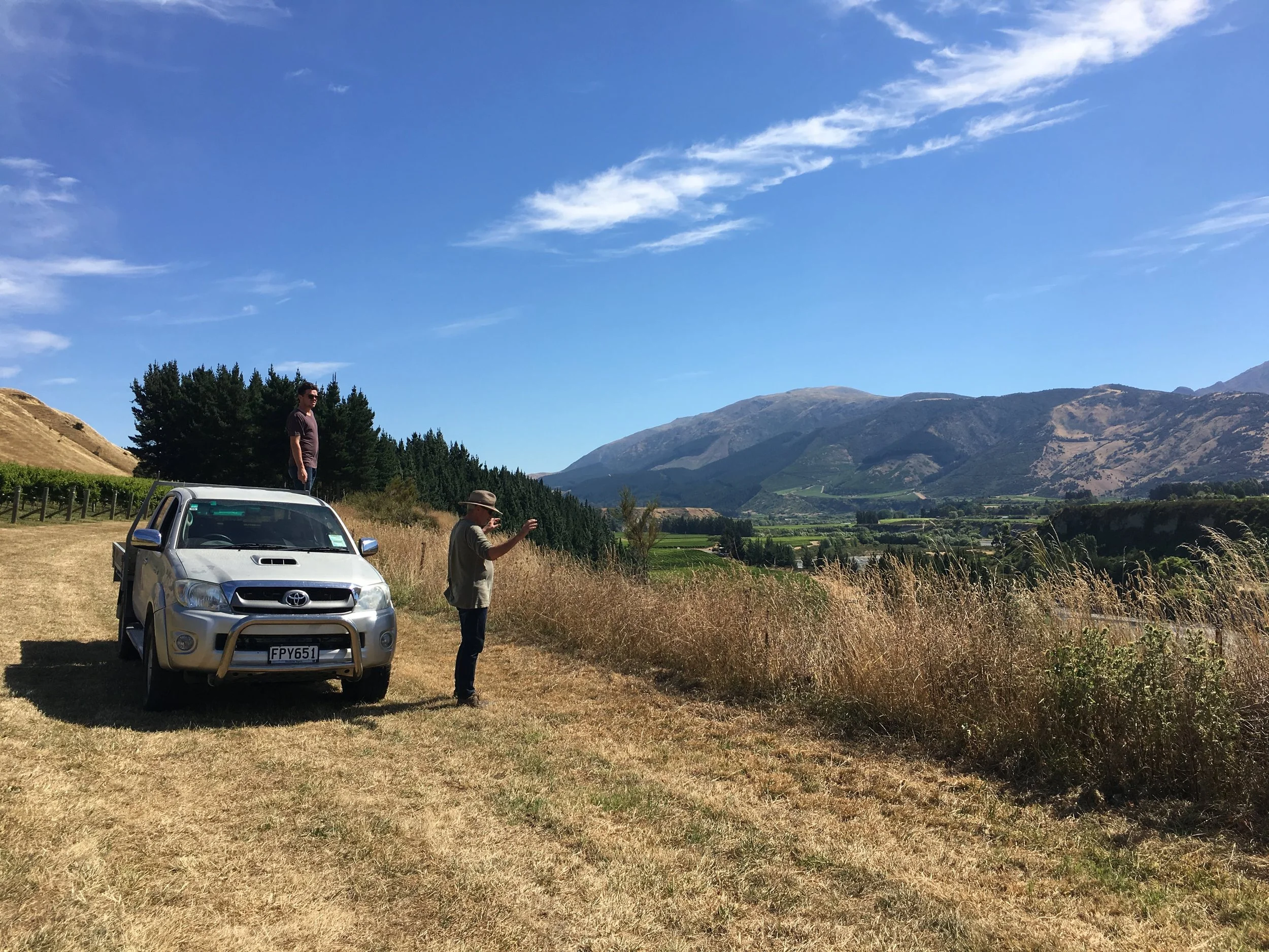 Kevin Judd - owner and winemaker of Greywacke, with Kohen Judd - overlooking the Awatere Valley.